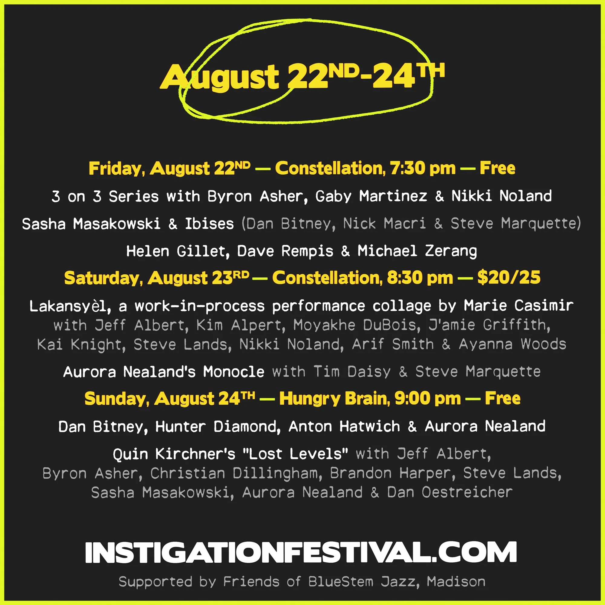The Instigation Festival brings Chicago & New Orleans music, movement and visual artists together for a week of improvised and interesting interdisciplinary collaboration in each city. Since its’ founding in 2016 by guitarist Steve Marquette and movement artist Marie Casimir, they have presented over seventy artists at twenty venues across seven festivals. Now entering its’ seventh year, the Instigation Festival continues its’ work of fostering connections between these cities’ creative arts communities, while expanding the scope to include European performers.